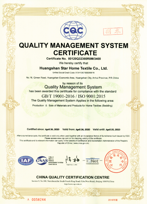 Over the years, the Spring Group has never forgotten its original intentions and has moved forward! We always pursued customer satisfaction, insisted on scientific research investment and technological innovation. After 13 years of development, we achieved certain results in the textile industry. In order to further standardize and improve the company's management system, our company decided to introduce the ISO9001: 2015 quality management system to promote the standardization, procedure and standardization of the company's internal management. After careful review by the expert group, Spring Group officially passed the ISO9001: 2015 quality management system certification review in May 2020 and obtained relevant certificates.